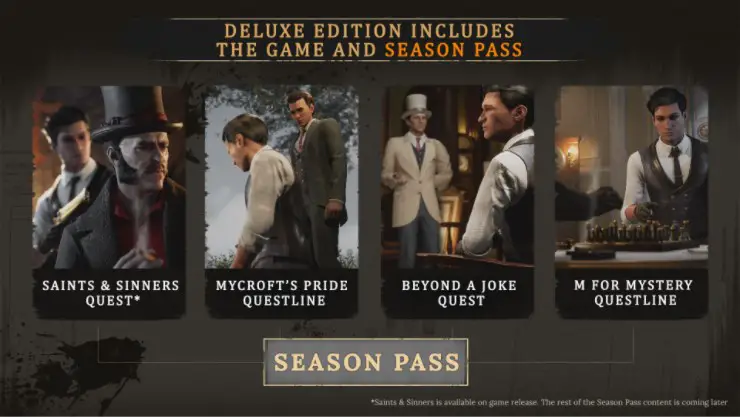 A Deluxe Edition has also been revealed. It includes the base game + season pass that includes new quests: Saints & Sinners (Available day 1), a questline linked to Mycroft Holmes, a questline which pitches Sherlock against a mysterious shadow figure only known as M and more to be announced later.