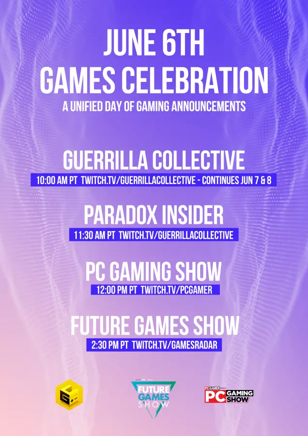 The June 6th lineup is today announced as a packed day of the latest news for every platform. At 10:00 am PT, the world’s first Guerrilla Collective Live will air, hosted by Kinda Funny’s Greg Miller. The PC Gaming Show returns triumphant starting at 12:00 pm Pacific Time with all the latest news and information about the PC gaming space. The Future Games Show presents reveals, developer interviews, and wholesome gaming chatter starting at 2:30 pm Pacific Time.