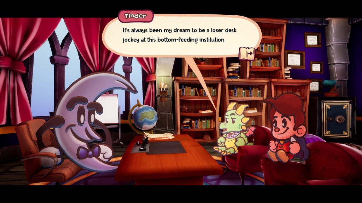 The premise is centered around hero Flynt Buckler, villain Tinder the Dragon, and their temporary truce to thwart Ever After Inc. — a “real-world” conglomerate bent on infiltrating beloved fairytales and folklore to farm resources and characters for labor. As a result, you’ll find Pinocchio working a desk job, Red Riding Hood manning a receptionist’s desk, the Three Little Pigs as an evil construction company, and Dracula as a… tailor. You’ll also see things like printers as save points, gold coins referred to as “wages,” and coffee as your mana pool. I love how much it plays into the theme of the corporate world blending into fantasy, and it left me eager to see what stories would be included and how they’ve been impacted by Ever After.