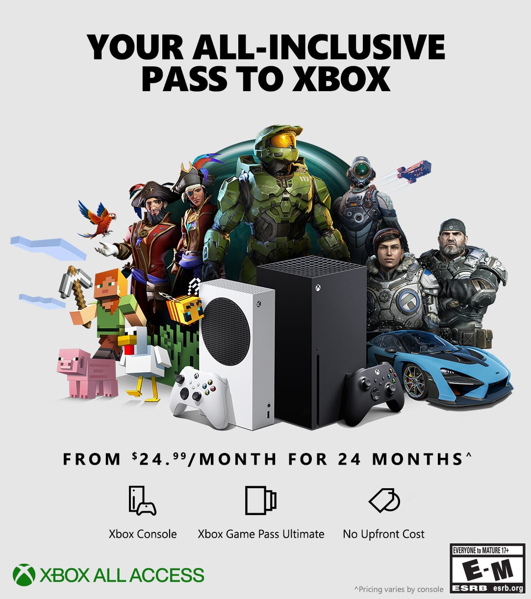 · The Xbox All Access program, which delivers everything a gamer needs to jump into the next generation, will expand to 12 countries this holiday season. With Xbox All Access, gamers can choose the Xbox console that fits their needs, as well as a 24-month membership to Xbox Game Pass Ultimate (access to over 100 high-quality games and online multiplayer with Xbox Live Gold), from $24.99 a month for 24 months – with no upfront cost.