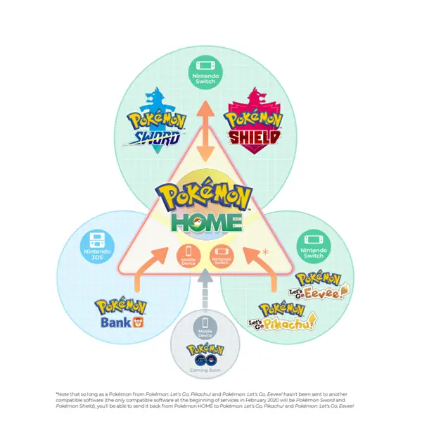 Pokémon: Let’s Go, Pikachu! and Pokémon: Let’s Go, Eevee! can link to the Nintendo Switch version of Pokémon HOME. Users can move Pokémon back and forth between Pokémon: Let’s Go, Pikachu! and Pokémon: Let’s Go, Eevee! or into Pokémon Sword and Pokémon Shield. Once a Pokémon from Pokémon: Let’s Go, Pikachu! or Pokémon: Let’s Go, Eevee! is moved to Pokémon Sword or Pokémon Shield, it cannot be returned to its original game.