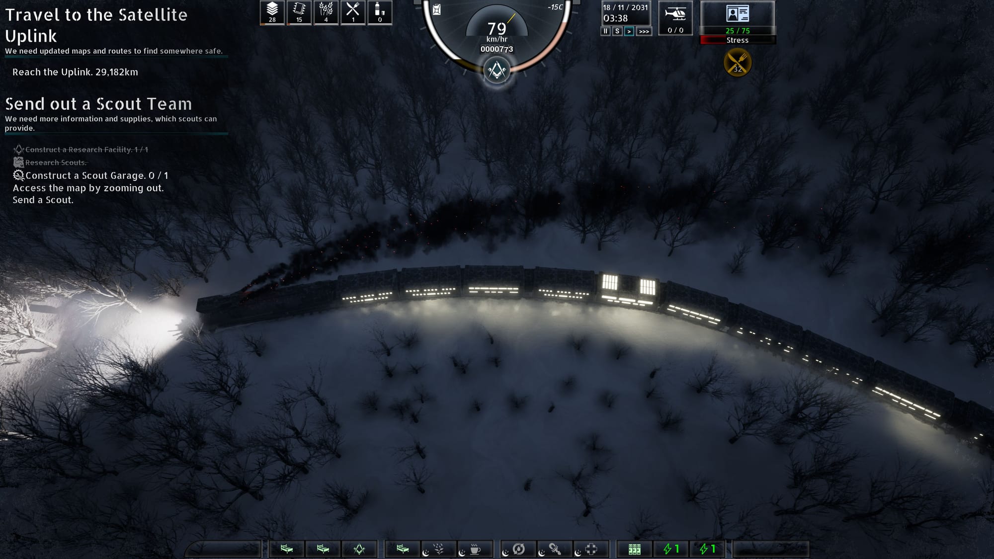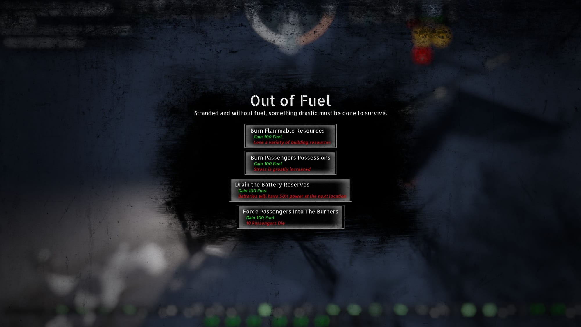 The engine isn't eternal, and you will need to regularly stop to scavenge for fuel, resources and survivors to keep the train running. However, once the train stops it no longer generates power, forcing you to rely on your limited reserve batteries to keep the heaters on and your passengers safe.