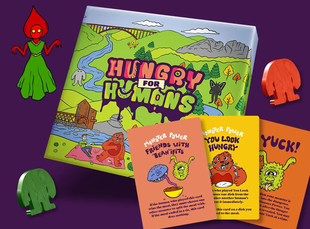Lonely Hero Games, formed in 2019 and based out of my home state of WV, have announced their Kickstarter campaign for their second release, Hungry for Humans. Previously, Lonely Hero Games published the critically acclaimed Bank Heist, which garnered a large amount of support on Kickstarter, amassing more than $13,000 from over 300 backers in just 30 days. Their second release, Hungry for Humans, is a unique card based game where players are protected by a monster friend, but must keep that monster friend happy by feeding him carefully selected meals – otherwise their hunger may turn toward you. To make matters worse, fellow players can attempt to sabotage your monster’s next meal. Featuring West Virginia restaurants, folklore creatures, and landmarks all beautifully drawn by WV artist Liz Pavlovic, Hungry for Humans looks to be the perfect game to add to your shelf.
