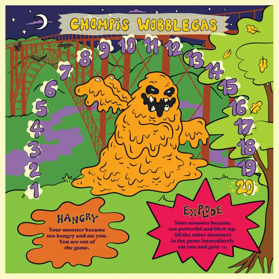 In addition to the restaurants, cryptids such as The Mothman, The Flatwoods Monster, The Grafton Monster and more appear in the game to help you sabotage your opponents and help your monster win. The game’s box artwork features The New River Gorge, Seneca Rocks, Summersville Lake, and Babcock State Park. All of the artwork was created by Liz Pavlovic who has become well known in the WV art community over the last several years with her unique artistic style and popular WV cryptid illustrations.