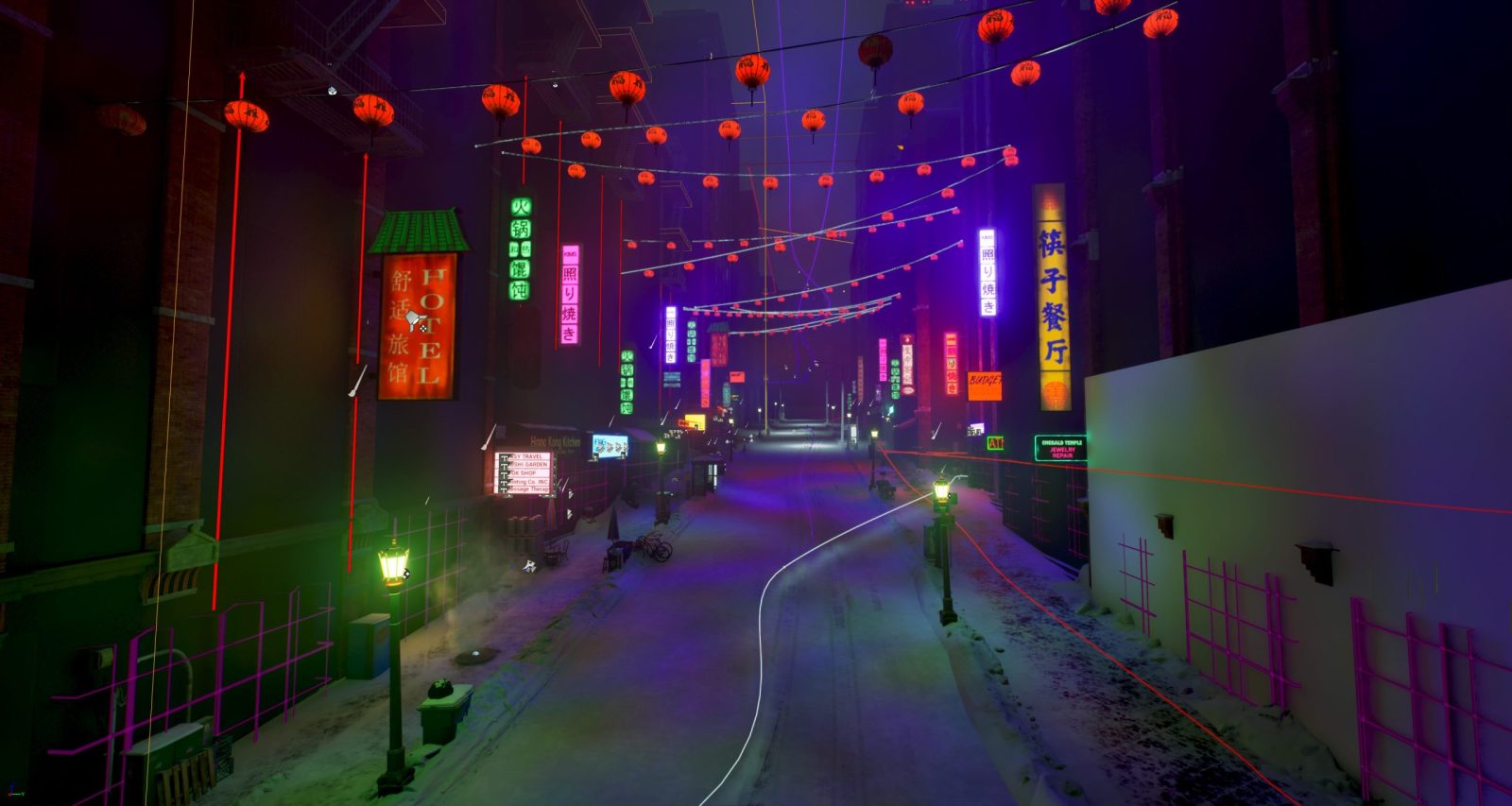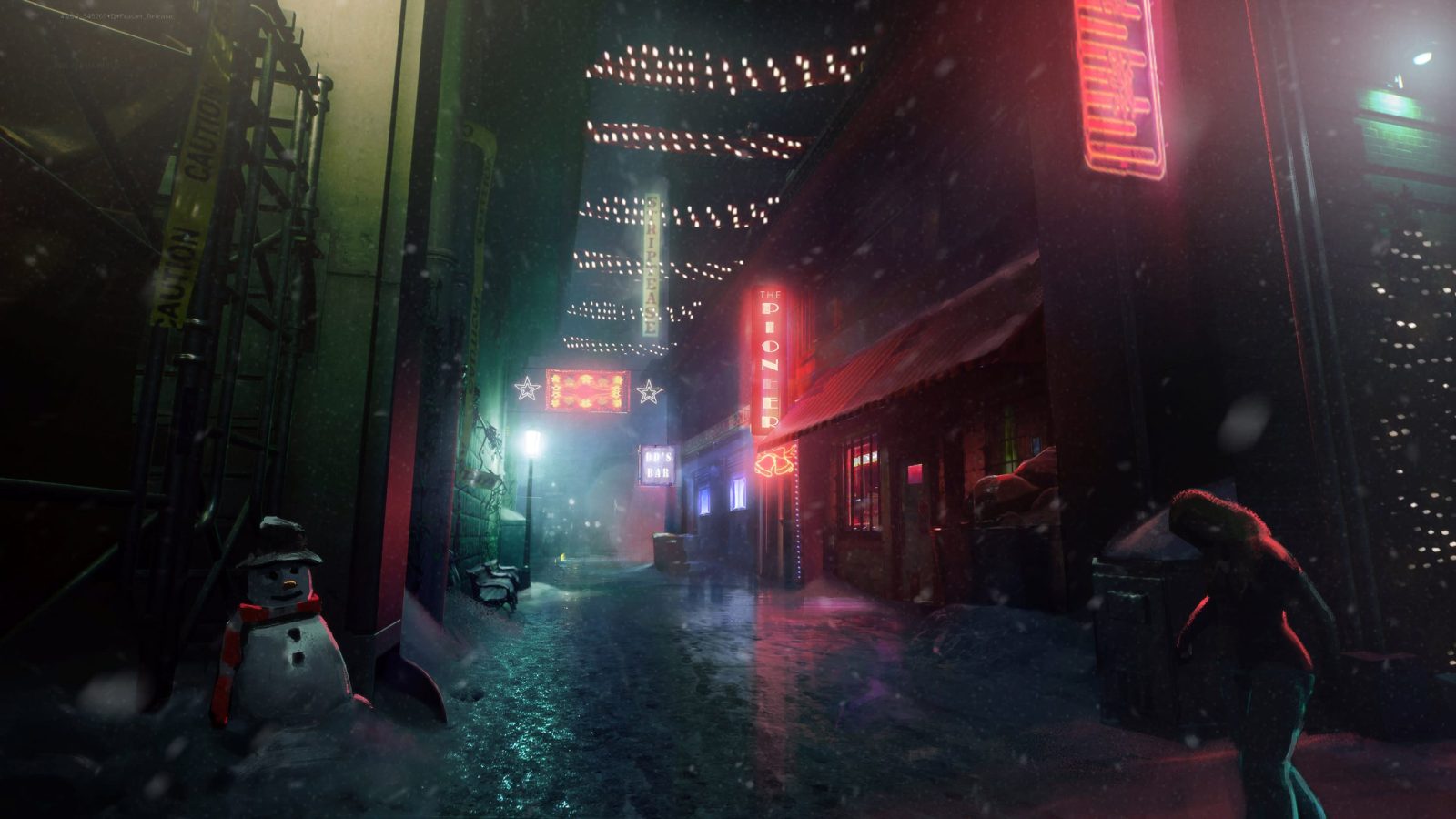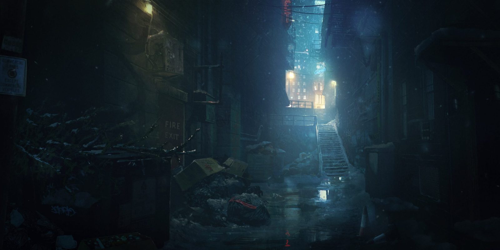 “In these concepts we were exploring the look and feel of the Pioneer Square section of the city. We were tasked with making sure this area of the city feels cold, atmospheric and is bathed in neon light. One of the main focuses of our art direction is making sure we’re always leaning into this neo-noir look for our world, a high contrast visual identity that is brooding and moody. Additionally, we were tasked with putting together several shopfront ideas that could appear throughout this area of the city.”