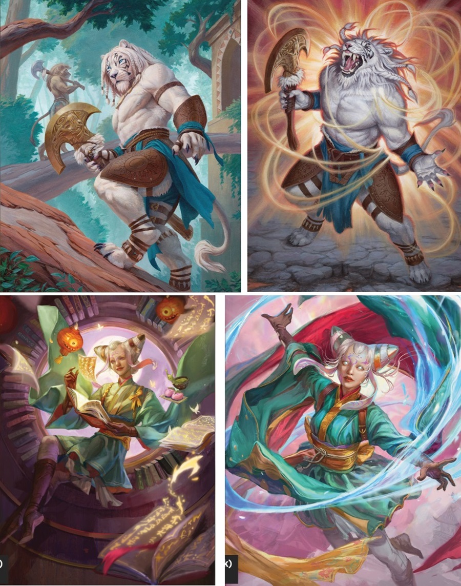 Ajani Nacatl Pariah front/Ajani Nacatl Avenger back and Tamiyo Inquisitive Student front/Tamiyo Seasoned Scholar Back