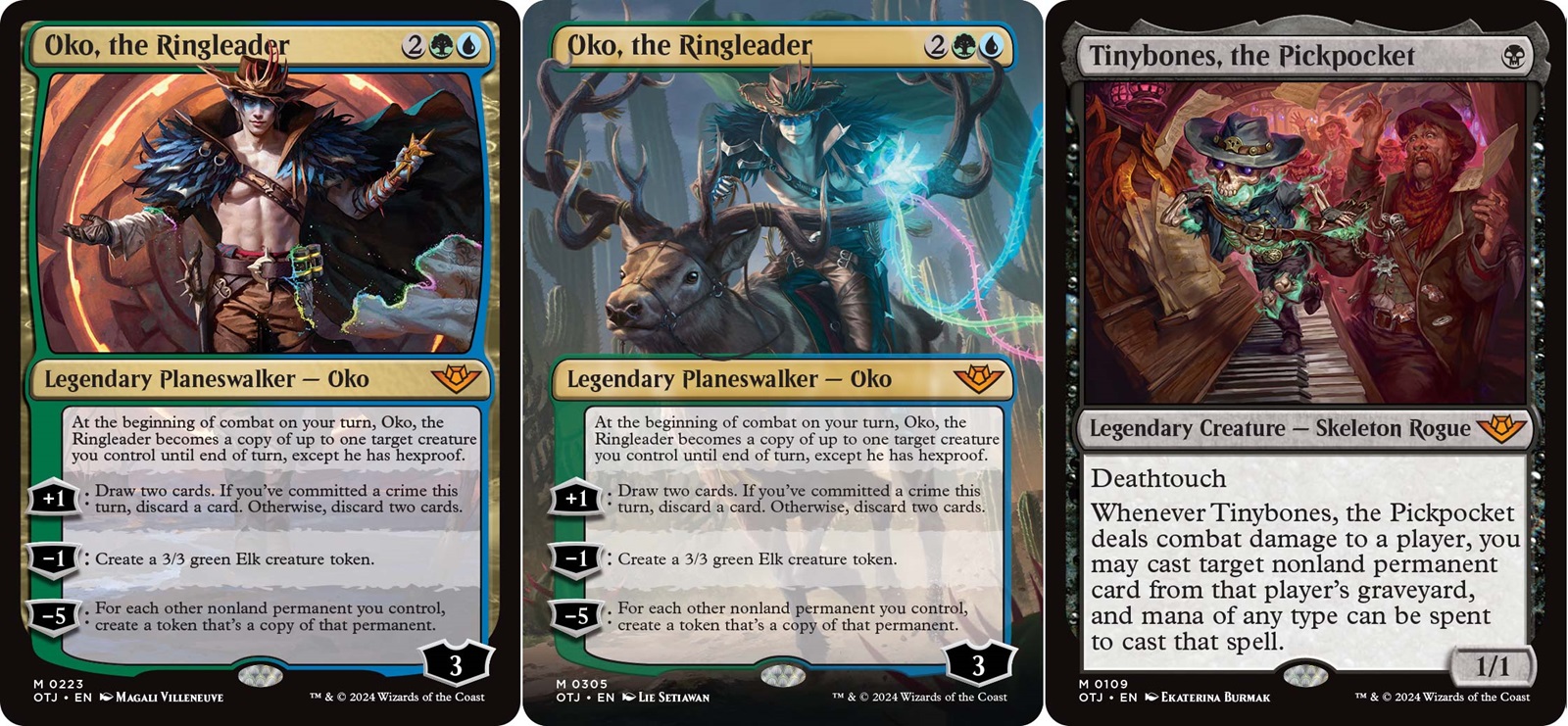 The next Standard set is the long fabled western inspired plane of Thunder Junction. Oko is back and he’s assembling a team of infamous outlaws to pull off the greatest heist Thunder Junction has ever seen. He also has some of my new favorite words on a Magic card ever printed, “If you’ve committed a crime this turn.” What does committing a crime mean? Any time you target your opponents or any of their stuff (spells, permanents, graveyard, etc.) you’ve committed a crime. It turns out we’re all criminals.