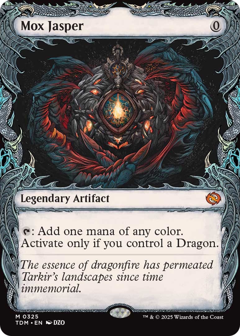 The serialized headliner card for Tarkir: Dragonstorm is the new Mox Jasper card. The serialized retro frame double-rainbow foil can be found in Collector Boosters while normal versions can be found in Play Boosters.