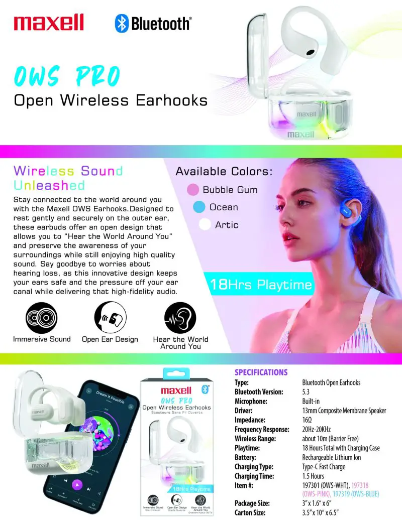 Maxell, a leader in consumer electronics, has unveiled their OWS Pro Open Wireless Earhooks. These earbuds deliver immersive sound while keeping users connected to their surroundings and are perfect for the office or outdoor settings. The OWS Pro Open Wireless Earhooks feature 18 hours of playtime when used with their charging case and 6 hours of playtime with just the earbuds. You can learn more below: