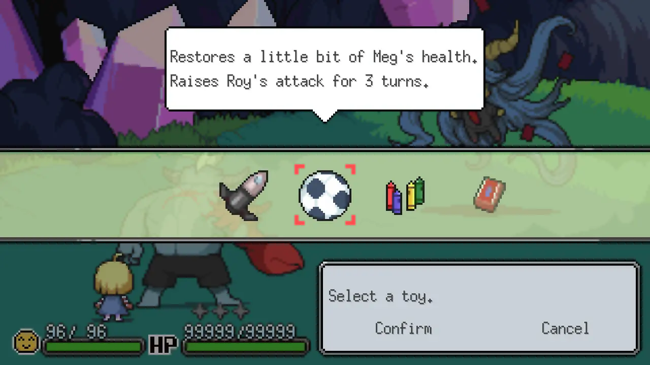 Meg, the human child, (whose tears just so happen to hold the power to bring forth the apocalypse) winds up in a world full of mutants and monsters who eat humans for breakfast. It’s up to a hulking brute named Roy and his pal Golan to help her make it back home. As they scour the Underworld for clues regarding her mother’s whereabouts, the trio will slowly warm up to one another, while also uncovering some truly astonishing secrets about their world and themselves.Meg’s Monster’s retro style and simplicity in presentation quickly unfolds into a challenging, amusing and must-play RPG. The narrative quickly pulls the player into the story whilst at the same time giving a real empathy for the main and central characters. Over 50,000 words of dialogue give a rich and compelling narrative to the many battles that will ensue as you venture forth. Each battle comes with its own unique mechanics and minigames to master as you duke it out while protecting and keeping Meg happy with her favourite toys. Yes, keeping Meg calm and happy is just one underlying factor, and a nice toy will achieve this, but it’s not that simple!