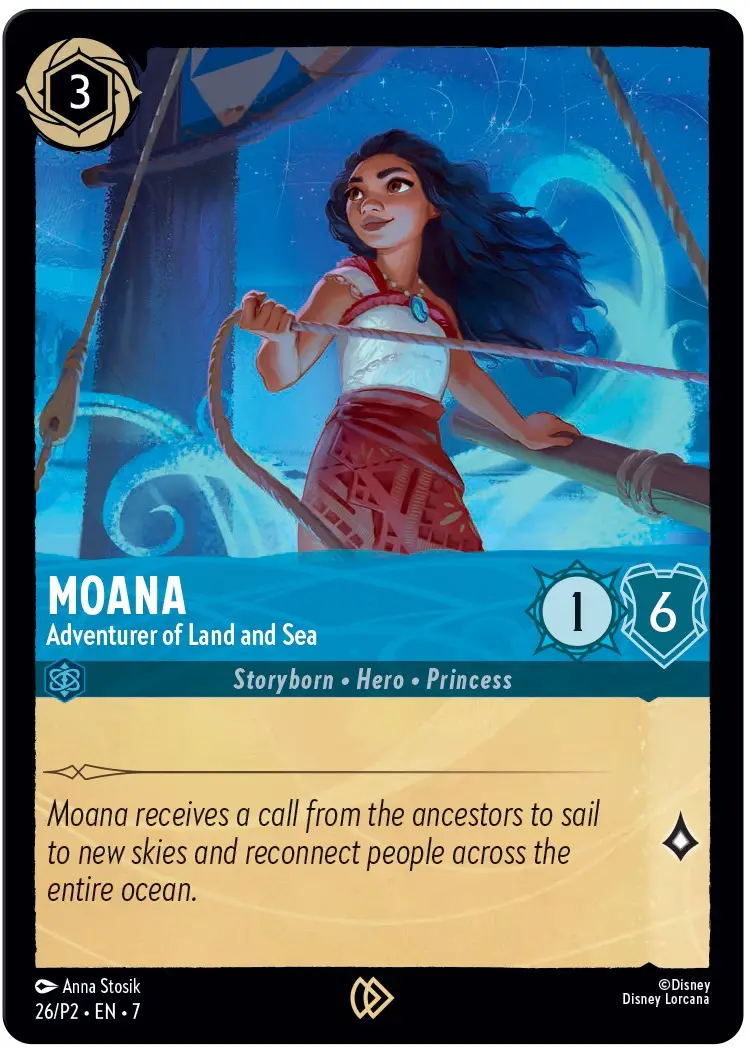 The Disney Lorcana TCG special preview promo card, Moana — Adventurer of Land and Sea, is a sneak peek of a card from a future Disney Lorcana TCG set. The promo card artwork is inspired by Moana 2 and features a silver foil treatment.
