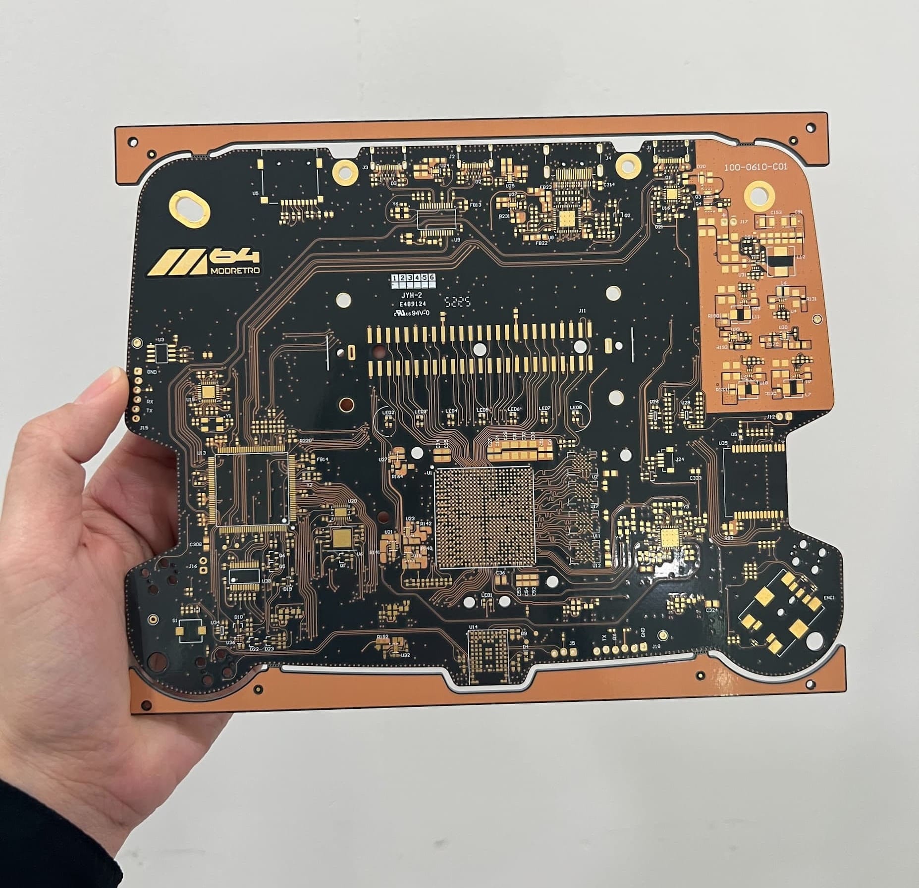 The M64 PCBA. Black pre-preg, clear soldermask, gold traces.