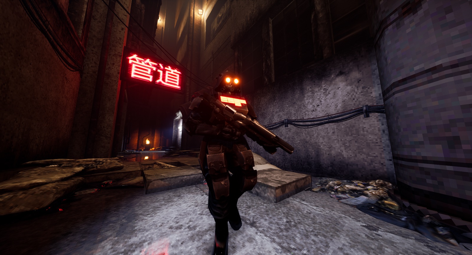 Enhanced with cybernetic implants, the player character “Seven” can scale walls and slow down time using excess adrenaline drops from dismembered enemies. With a roster of different troop types and carefully designed weapons, the player will be pushed to the limit managing their adrenaline reserves, ammunition, and weapon choice in a high-speed game of “combat chess.”