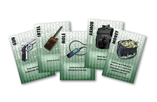 Each round, players take turns until everyone has played four cards, and everyone has had four cards played on them. Guns deal wounds (but only when they come in pairs), Armor cancels Guns, Intel can check hidden roles, and more. And every round, Money talks — you can spend yours to gather info and heal wounds.