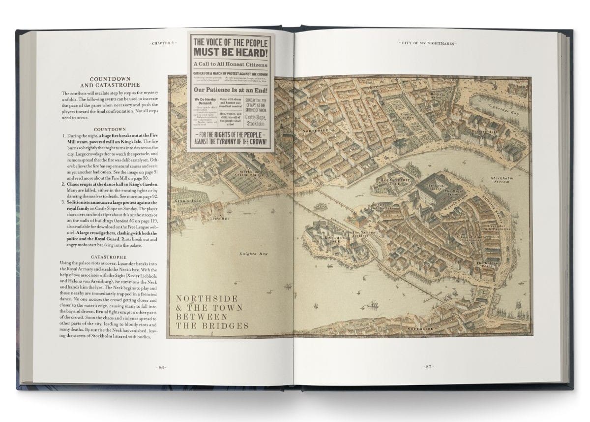 - A large city map and oversized newspaper handout (format 17 x 22 inches / 432 x 558 mm) that enhances investigation and worldbuilding