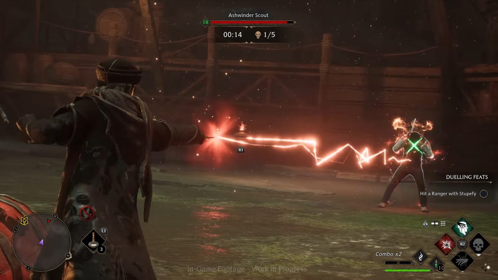 In a deeper dive of the combat, the player, wearing the Dark Arts cosmetic set, walks through the Forbidden Forest before riding a Thestral to the Dark Arts Battle Arena. The Dark Arts Cosmetic Set, Thestral Mount, and Dark Arts Battle Arena are available exclusively in the Hogwarts Legacy Deluxe Edition or for purchase in-game in the Dark Arts Pack. The player immediately casts an Avada Kedavra spell to show the enemy’s health bar instantly go to zero. Tools such as potions and plants from the Room of Requirement can be brought with the player into combat to help defeat enemies more efficiently.