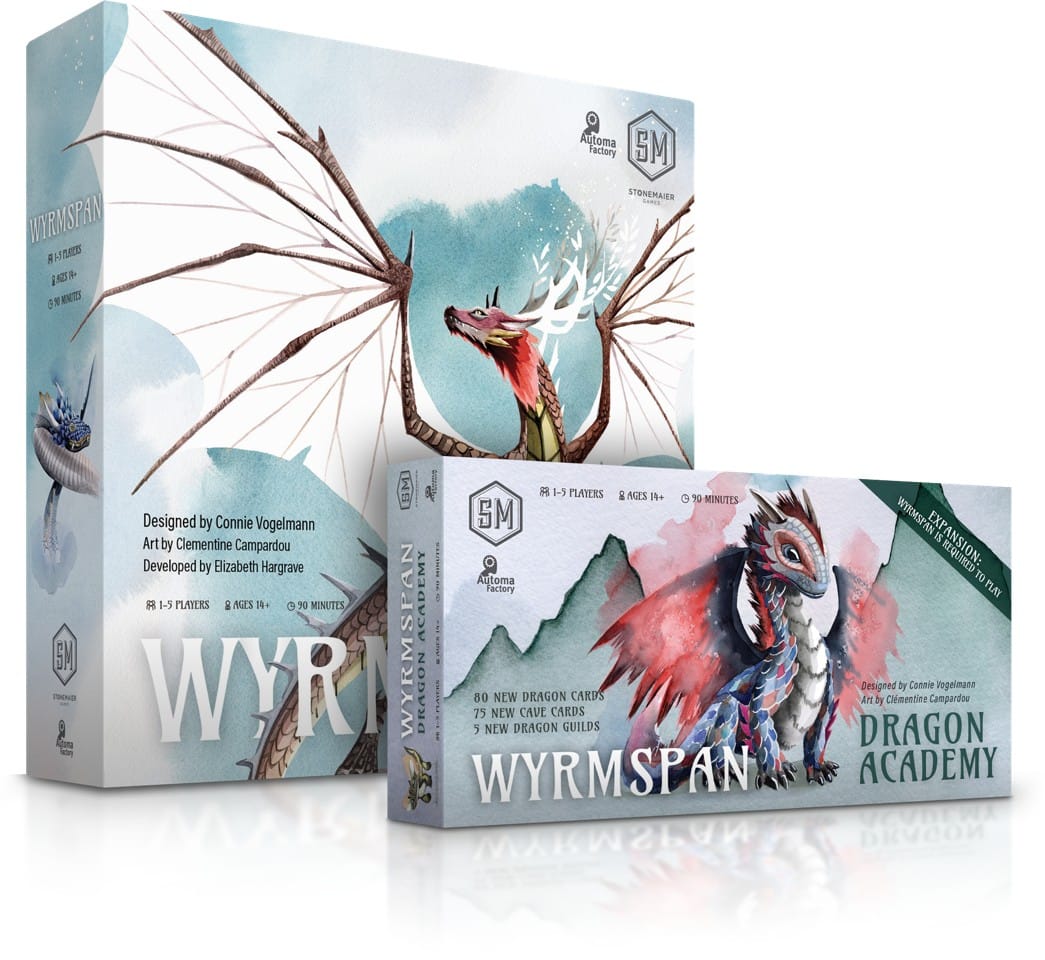 As a budding dracologist, you open an academy for fledgling dragons to achieve their full potential! The expansion to Wyrmspan adds a wide variety of new dragons and caves, objective tiles, dragon guilds, and a new round tracker that presents you with an income choice when you pass for the round. Welcome to Wyrmspan: Dragon Academy, designed by Connie Vogelmann and illustrated by Clémentine Campardou!
