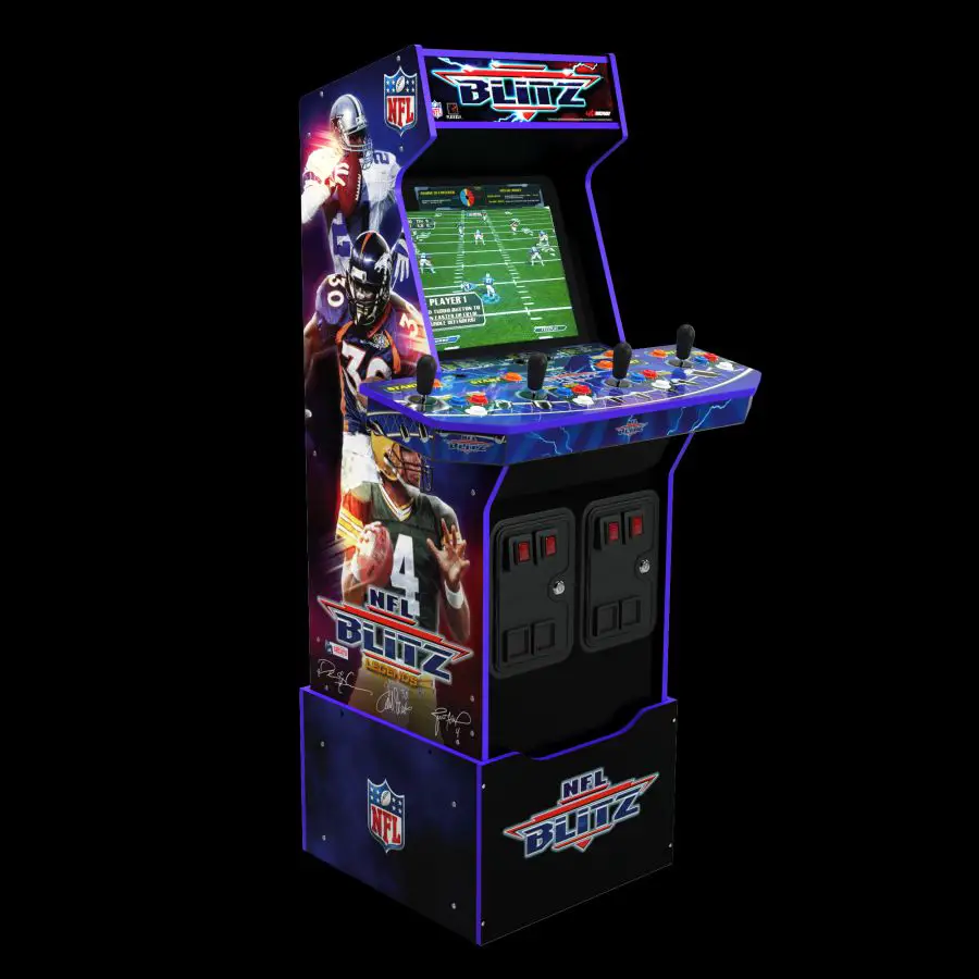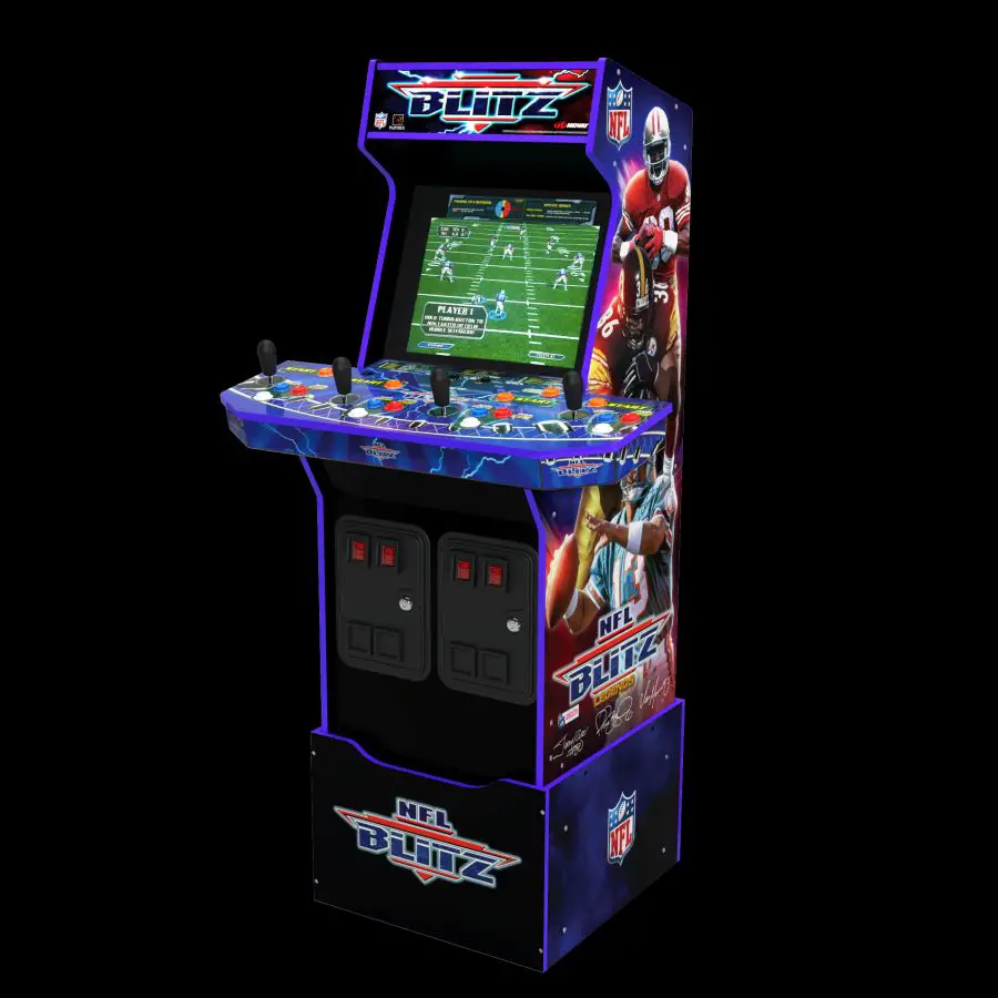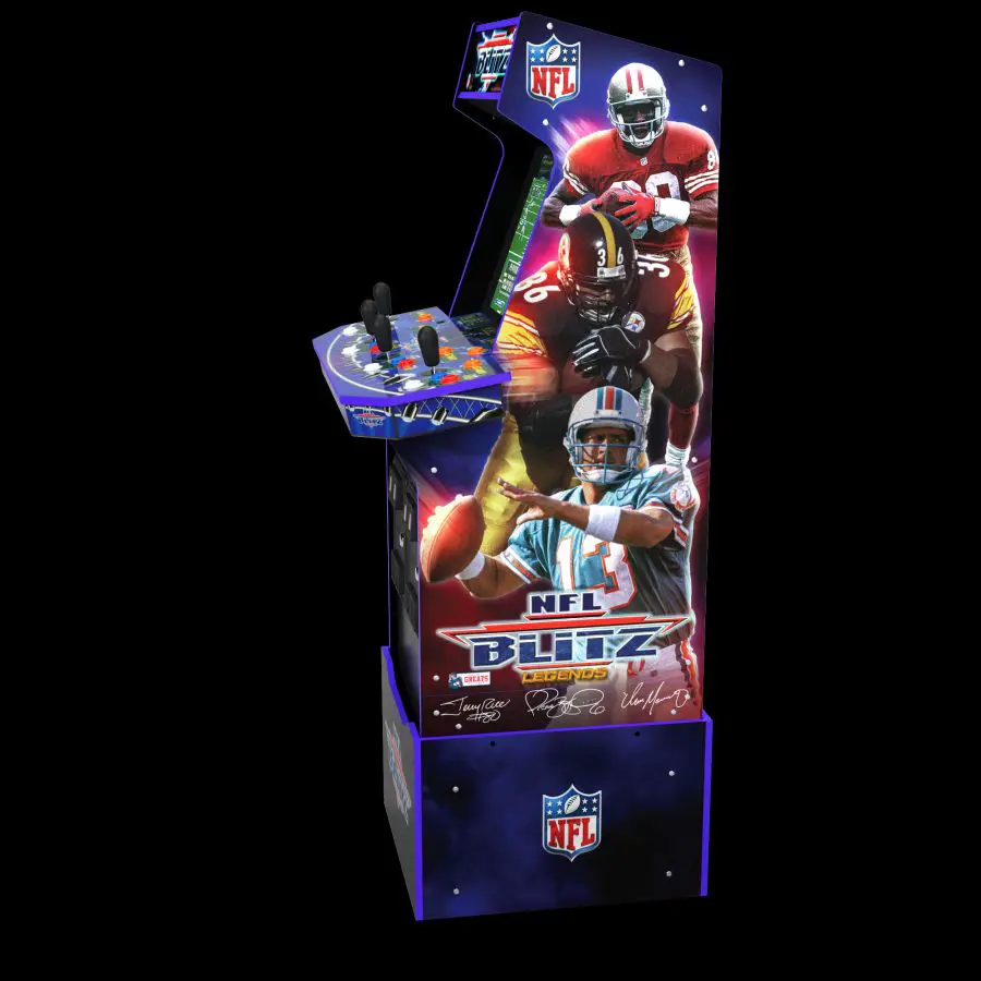Built to resemble the iconic NFL Blitz found at retro arcades, NFL Blitz Legends is a five-foot-tall arcade machine featuring NFL legends on the sides of the cabinet. The artwork and gameplay also feature retro team logos and uniforms, adding to the authenticity of the gaming experience. In addition to Wi-Fi multiplayer and leaderboards, the arcade machine has a 49-way joystick and 17-inch screen with a light-up marquee, and branded riser.