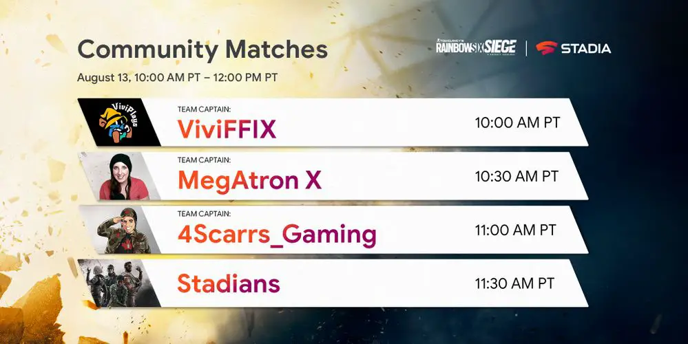 To celebrate these Free Play Days, on August 13 from 10 AM PT to 12 PM PT, Stadia team members will play with Stadia Creators and the community in Rainbow Six Siege. Check out the schedule below, and follow Stadia on YouTube, Twitter, Facebook, and Instagram for more for the latest on game day.