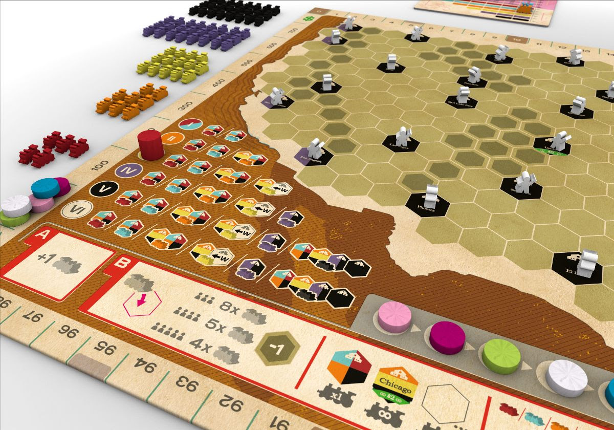 In Ride the Rails, you will invest in railroad companies, build railway track across America, and deliver passengers to as many cities as possible. Each round, a new Railroad company is introduced to the game, and each Railroad company has its own special placement rules! Deliver passengers to as many cities as possible to earn the most points. Be cautious in your travels, as shareholders of Railroads that you use will also earn points!
