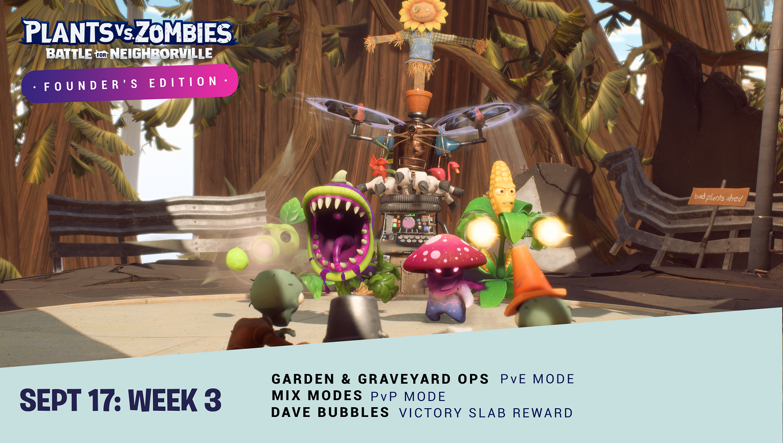As part of the week 3 update for Plants vs Zombies: Battle for Neighborville, mixed modes arrive in multiplayer including Gnome Bomb, which includes the capture gameplay of Suburbination and orb collection of Vanquish Confirmed. In addition, Garden & Graveyard Ops has been added as PvE modes.