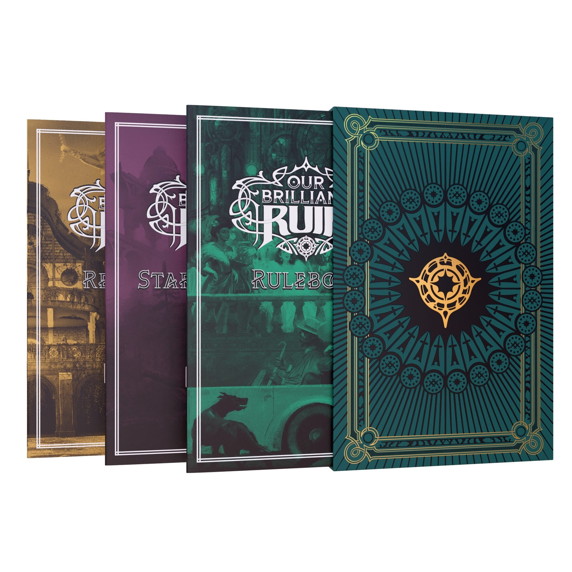 - Abridged Rulebook – A 64 page softcover, full colour rulebook for a quick start in the world of Our Brilliant Ruin.