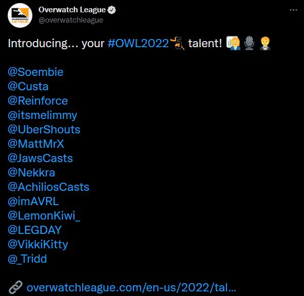 The Overwatch League announced their full talent roster today. Featuring familiar faces the community has come to love and newcomers who brought us the best action from Overwatch Contenders, the stage is now set ahead of the start of the 5th Season. You can learn more about all these talented casters here and learn too much about them with this unsanctioned talent announcement.