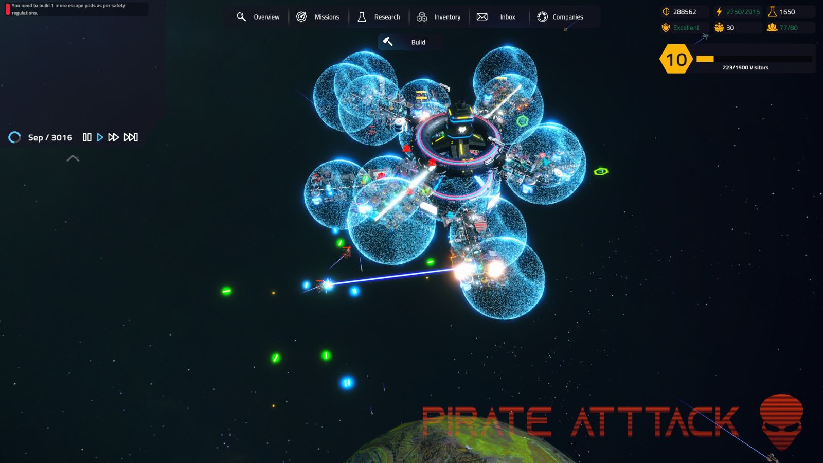 Throughout the game you’ll unlock various guns that can be mounted to the tops of your station arms to defend against incoming pirates and meteors. You’ll also eventually develop shields to protect at least a small segment around them, blanketing about five pods with an energy field that can repel attack. Every time an attack or scientific misadventure hits my station, I’m dealing with repairs, starving my economy. Running a station is hard work! Bled completely dry, I take out a $3500 loan to keep from going bankrupt.