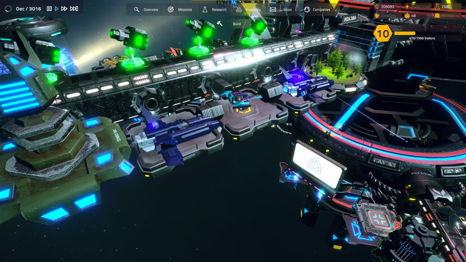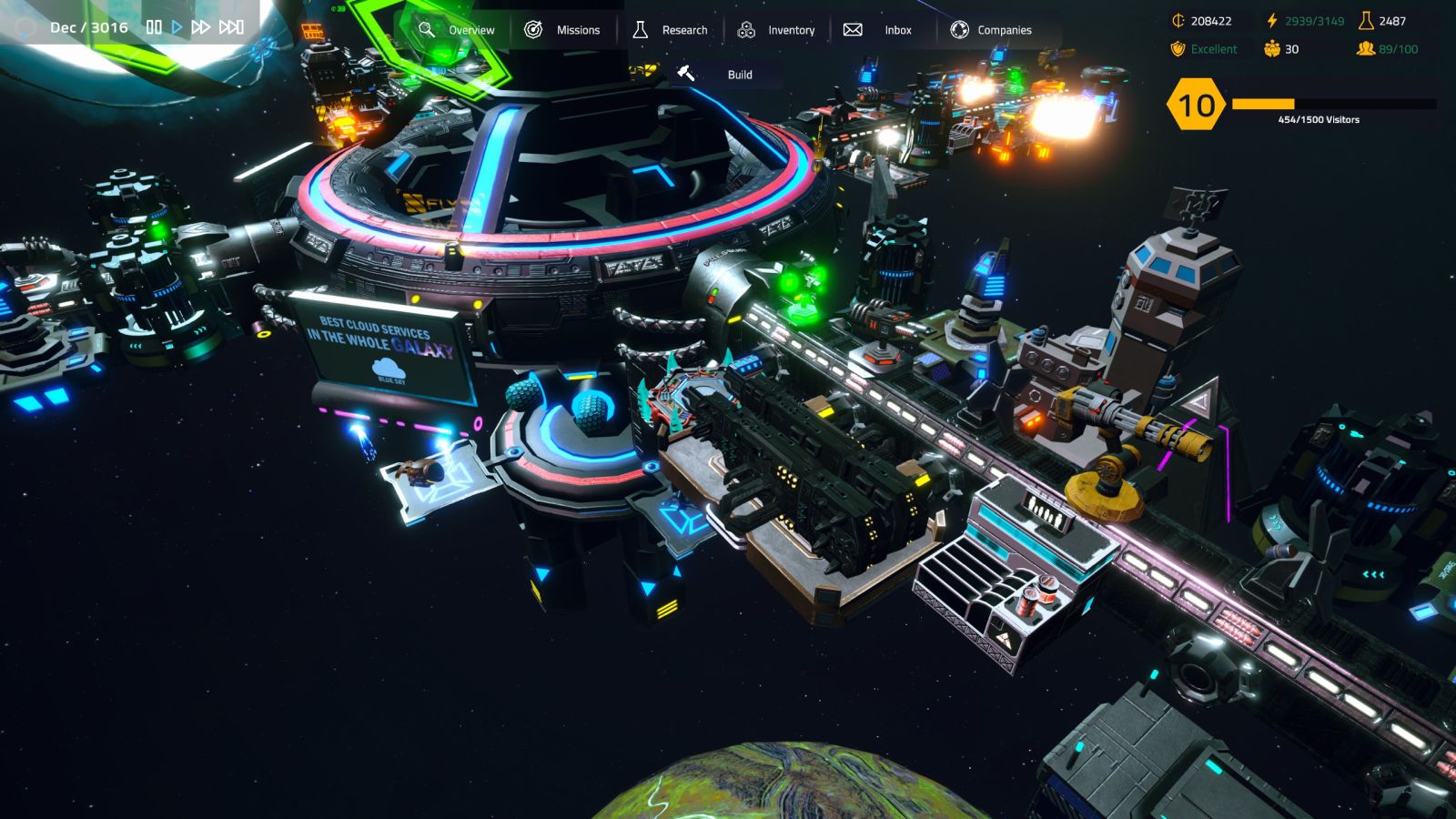 Digging out by controlling my costs, I slowly grow my station and my reputation among my neighbors begins to grow. I begin to use marketing campaigns to bring in more tourists, eventually touching on the very reason I started this station in the first place — aliens. Stumbling on a construction blueprint for an organic landing station, I took my first steps as an intergalactic power merchant. I repair ships, I’ve got a bar, I sell gas, I’ve got a hotel, and enough guns to keep it. Not a bad day at the office, and you can’t beat the view.