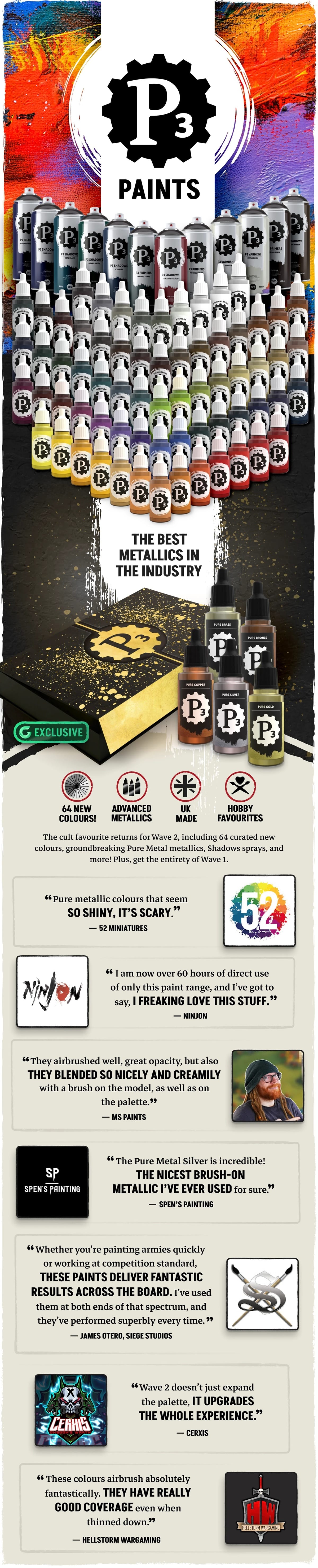 The acclaimed P3 Paints by Steamforged Games is back on Gamefound to add all new features to the P3 Paint line. With wave 2, there are 64 new colors, a new line of metallics, shadow sprays, primers and more. You can check out the campaign on Gamefound here.