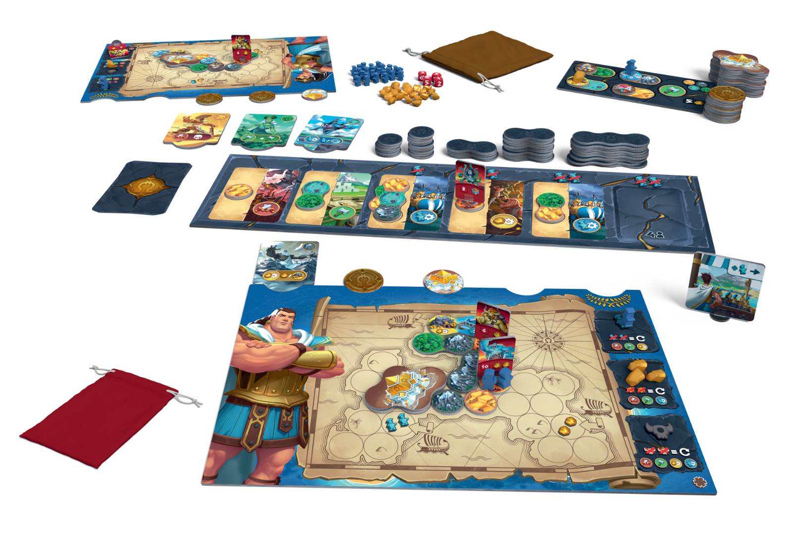 Orichalcum (formerly known as Orichalique) is a race against your opponents. Whoever is the first to collect 5 Victory Points above their board and eliminate all Creatures on their island will be the winner! There are three ways to earn victory points: draw the attention of Titans, erect Temples and forge precious Orichalque medallions – that legendary metal that only the Atlantes know how to extract.