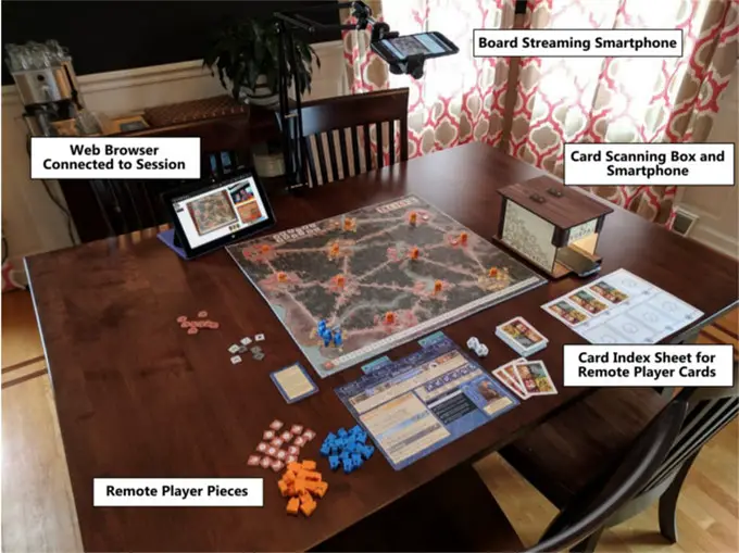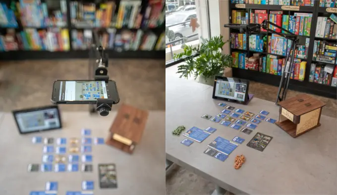 Game hosts use our smartphone app and mounting arm to stream anything on the table in high resolution. The card scanning box is used to privately scan cards or tiles for remote players. The Vorpal Board web application includes integrated video chat and a shared virtual tabletop so everyone feels like they are sitting at the same table.