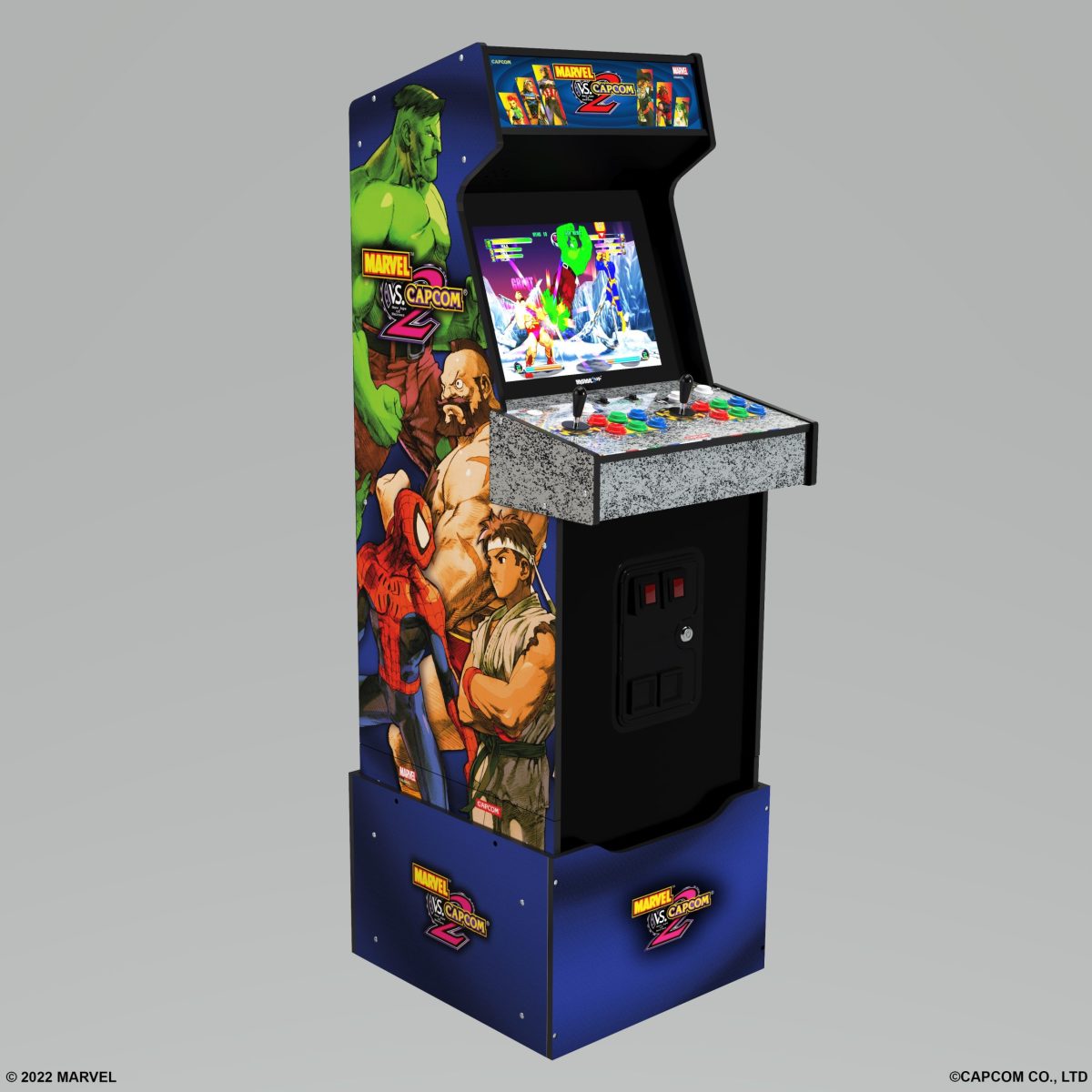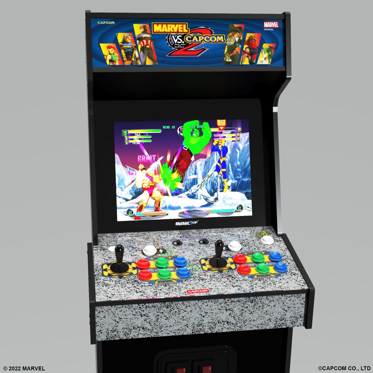 This epic cabinet features 8 classic titles including Marvel vs Capcom 2™, Marvel vs Capcom™, Marvel Super Heroes vs Street Fighter™, X-Men vs Street Fighter™, Marvel Super Heroes™, X-Men: Children of the ATOM™, X-Men: Mutant Apocalypse™ and Marvel Super Heroes in War of the Gems™ and more!