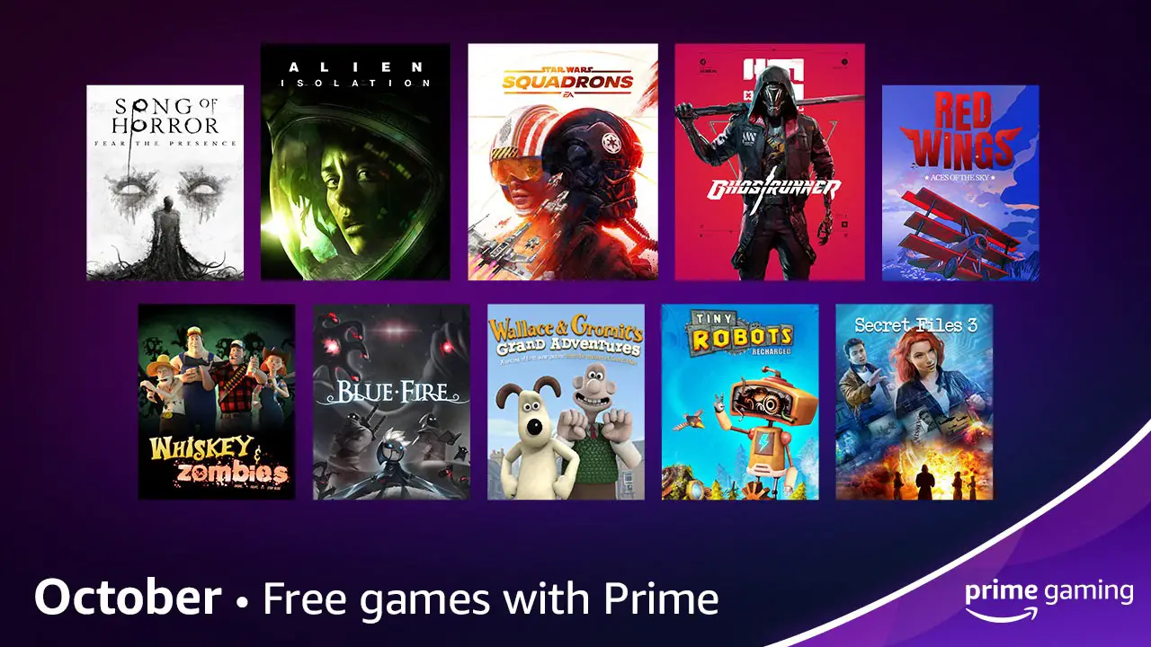 The October Free Games with Prime lineup, featuring STAR WARS: Squadrons, Alien: Isolation, Ghostrunner, Song of Horror Complete Edition, Red Wings: Aces of the Sky, Wallace & Gromit’s Grand Adventures and Secret Files 3.