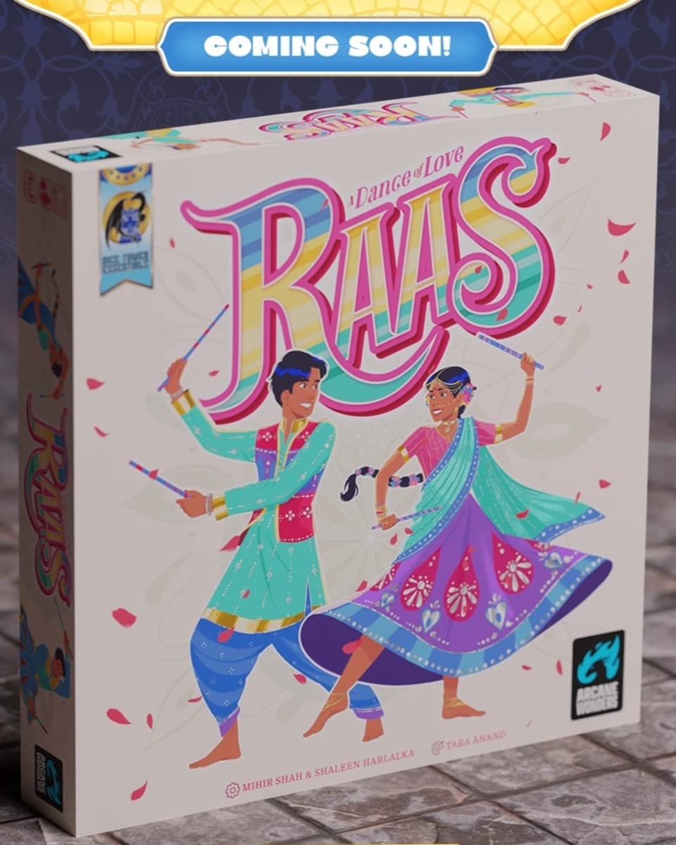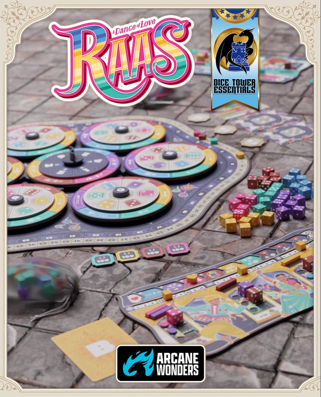 Raas: A Dance of Love is coming to Gamefound on October 14th. This new title by Arcane Wonders looks to bring color, dice drafting, and even more fun to the Dice Tower Essentials line: