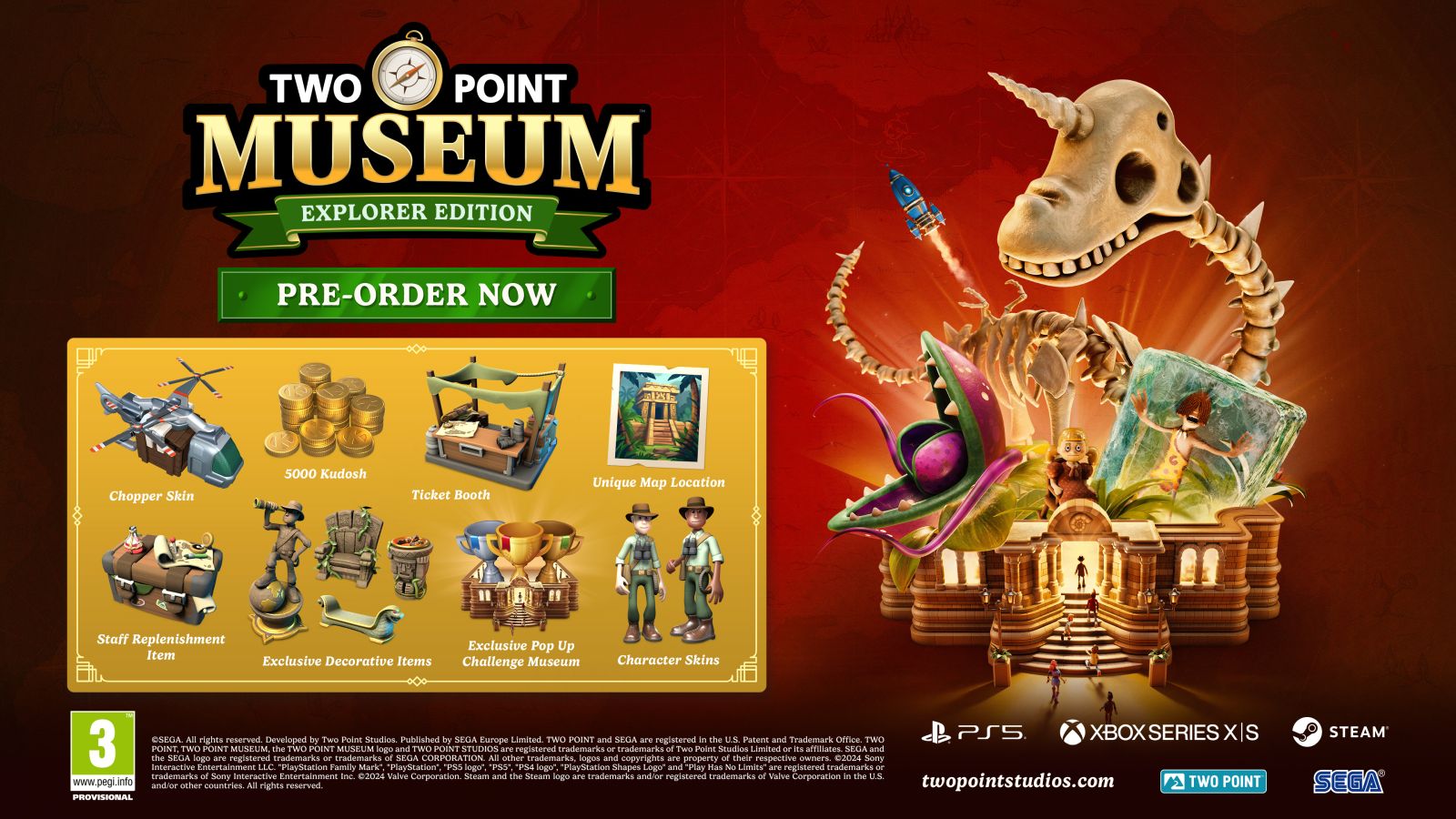 London, England – 19th September 2024 – Two Point Studios Limited and SEGA Europe Ltd are excited to announce that Two Point Museum will be launching on March 4 th , 2025, on PC, PlayStation® 5, and Microsoft® Xbox Series X|S with pre-orders now available on all platforms.