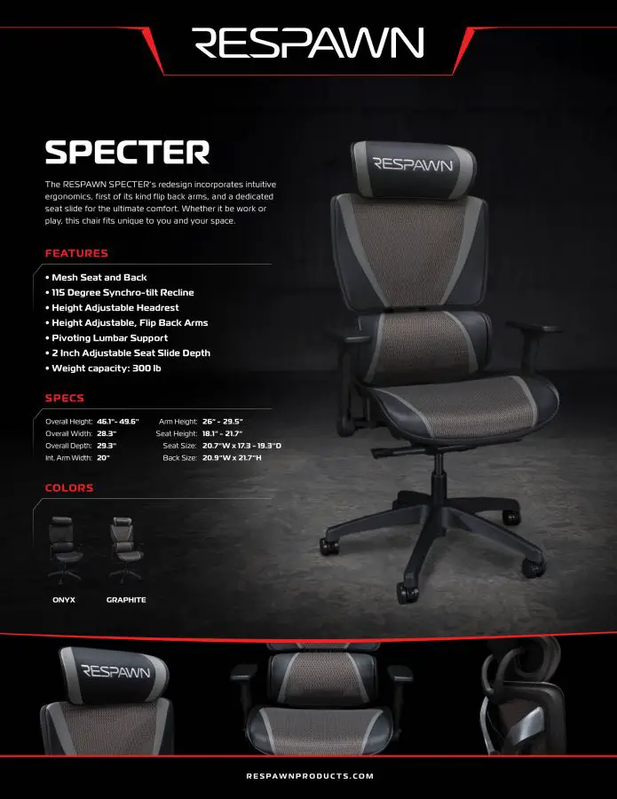 Are you a corporate exec by morning, gamer by night looking for a seating solution that supports all your life’s passions? Work-form-homers and hardcore gamers alike will appreciate the new RESPAWN SPECTER all-in-one gaming and office chair designed to elevate performance – for work or play. The intuitive weight-activated lumbar support and height-adjustable, pivoting headrest offer a more dynamic level of comfort and move with you as you go from buttoned-up conference call to action-packed gaming in seconds. Flip back, adjustable arms and sliding seat allow increased mobility and a variety of preferred seating positions – adding a welcomed competitive advantage. Plus, the full mesh backing and seat keep you cool in the heat of the moment while the waterfall front cushion provides additional comfort behind knee joints.