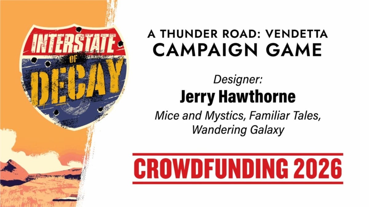The roads of the wasteland go ever onward, and we’re so excited for the newest entry in the Thunder Road: Vendetta world. Jerry Hawthorne, acclaimed designer of Mice and Mystics, Wandering Galaxy, and more, joins David Chalker and Brett Myers for a new Thunder Road expansion: The Interstate of Decay! Build your crew up as you race through a four part campaign story. Coming to Kickstarter in 2026, sign up here to be notified when it launches.