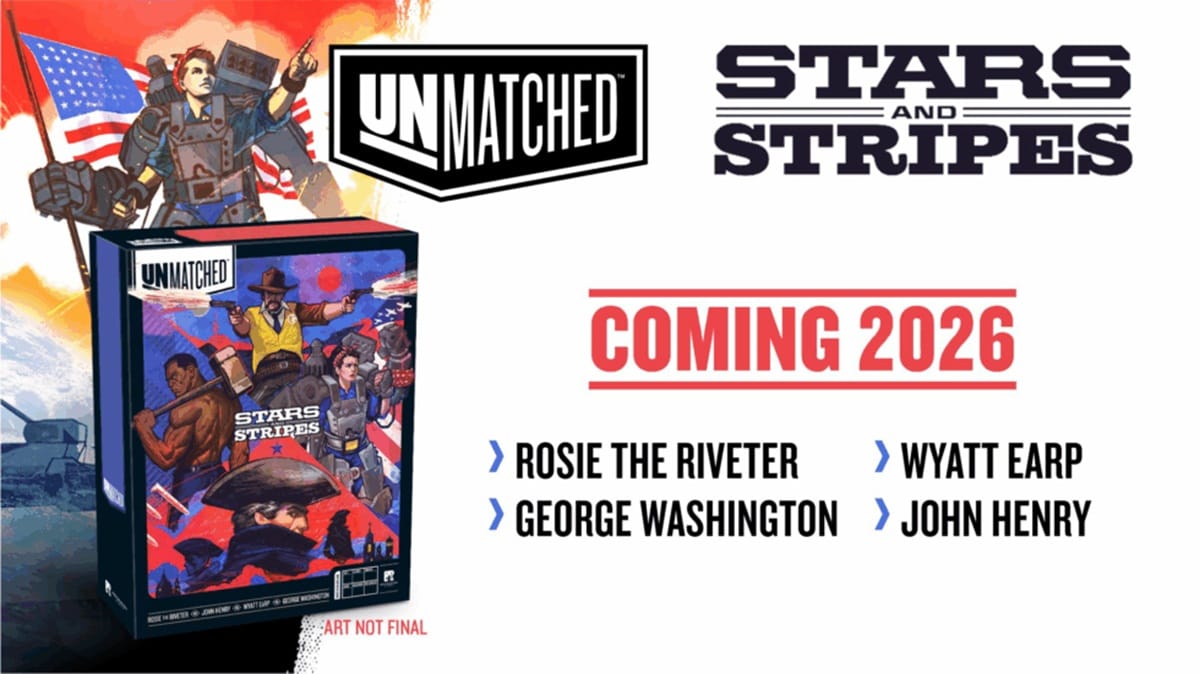 Featuring three characters from our design contest, Unmatched: Stars and Stripes brings Rosie the Riveter, John Henry, George Washington, and Wyatt Earp to the battlefield! Gorgeous illustrations by Brave Union bring this set to life. Coming 2026! Sign up to be notified when it’s available here!