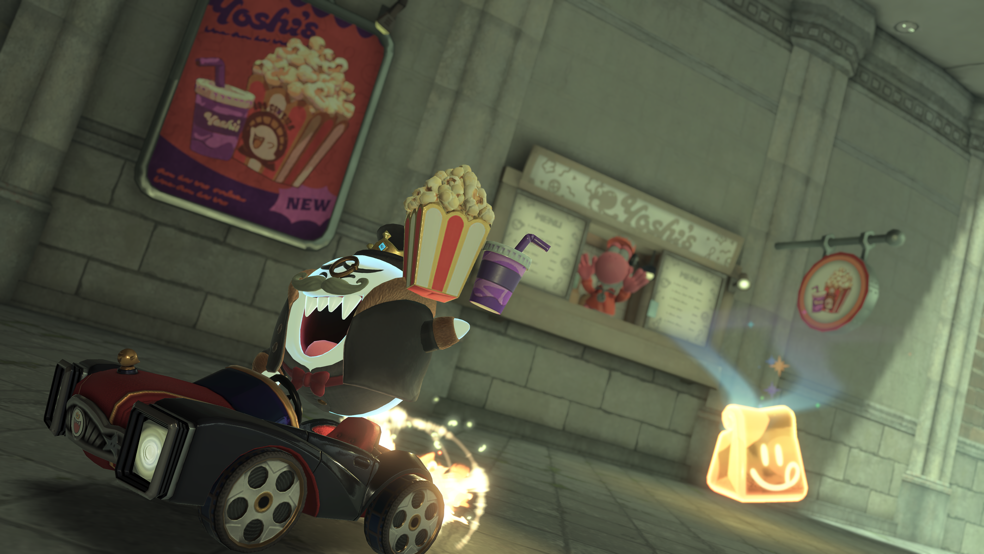 Drive-Thru and Roll-Out: Make a pit stop at Yoshi’s for a local delight: Dash Food! These to-go orders will give you a speed boost and sometimes also unlock outfits that can be donned from the character selection screen. There are plenty of dishes and outfits to find, so drive through when making your way around Mario Kart World.