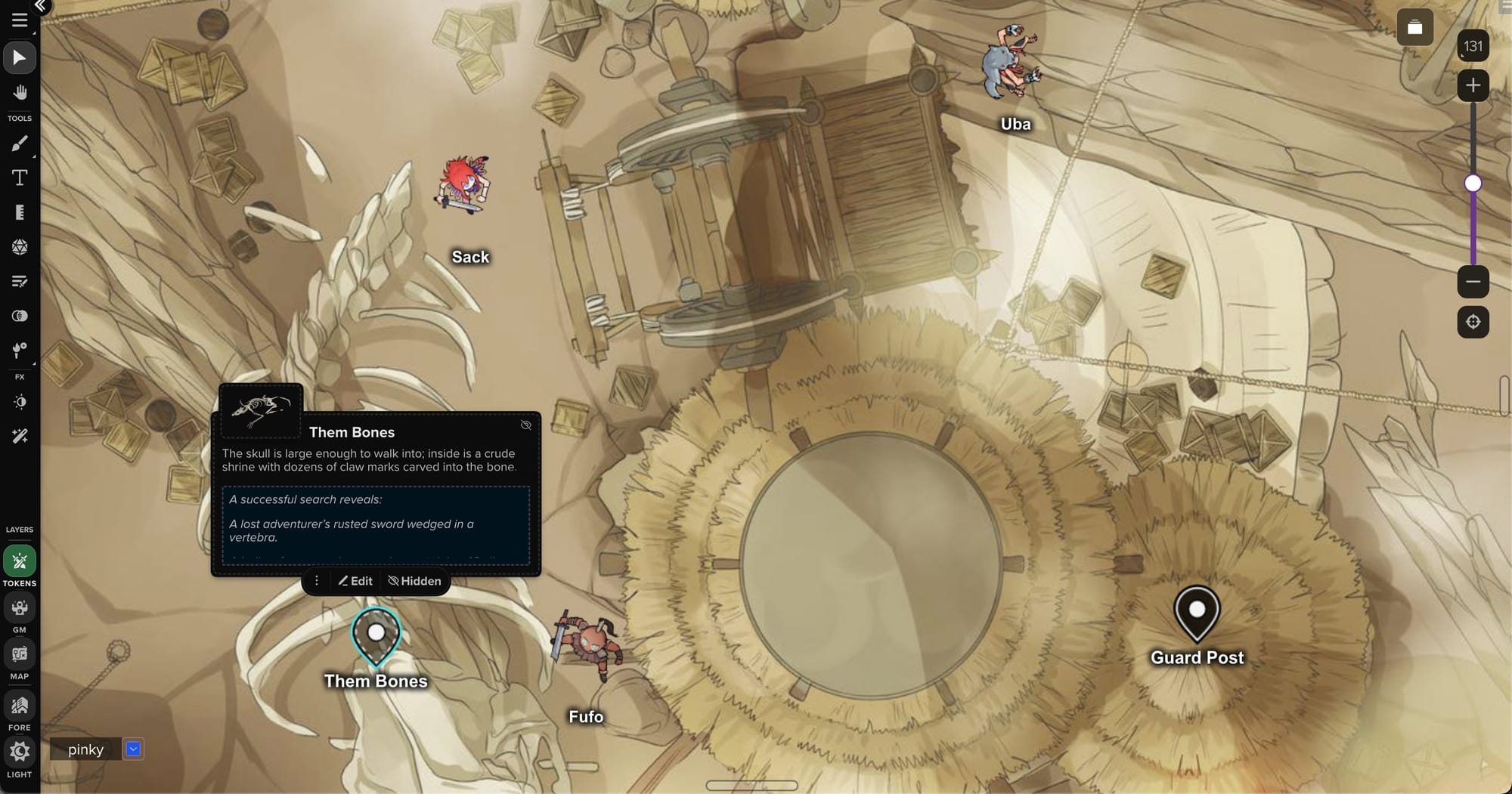Map Pins are layerless, meaning they can be accessed and edited by GMs from any tabletop layer without needing to switch, saving time during setup. Common use cases for pins include: