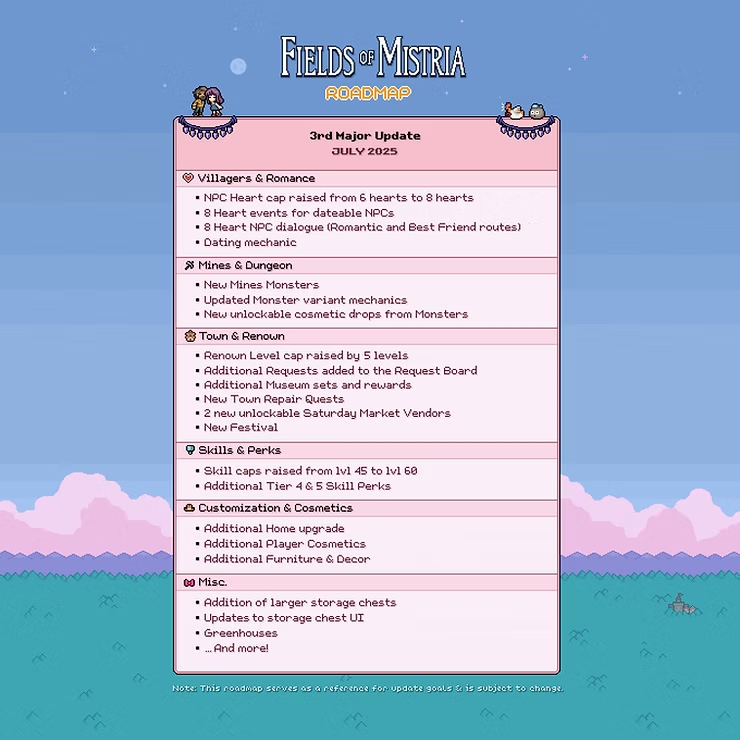 We are excited to share that Fields of Mistria's 3rd Major update will launch in July!