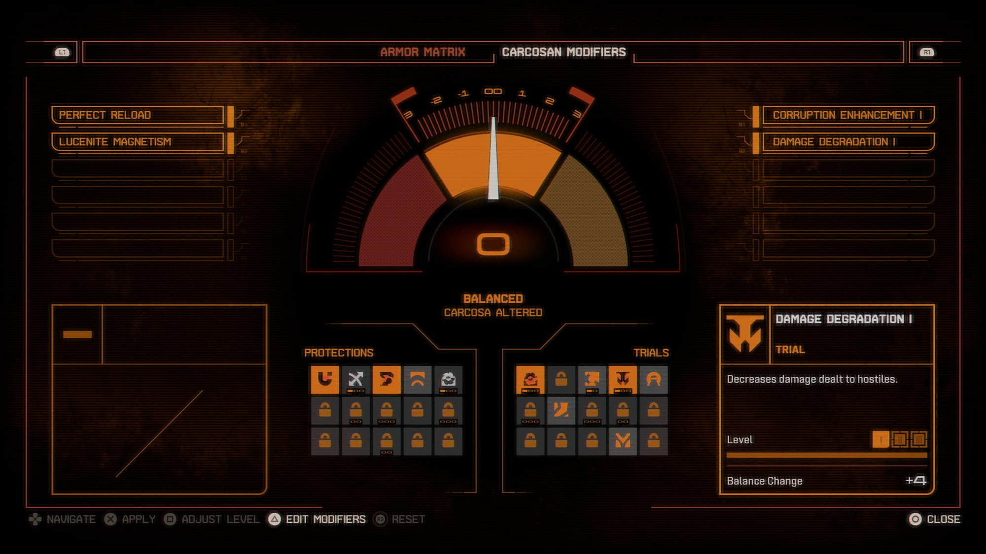 With Carcosan modifiers you can adjust your experience to make Saros more challenging or more forgiving. Carcosan Modifiers come in two types: Protection Modifiers reduce challenge by doing things like decreasing incoming damage, making it easier to reload your weapon, or extending the time you can use your Shield. By contrast, Trial Modifiers make the game more challenging by making Hostiles more aggressive, your weapon’s power degrade over time, or even removing your Second Chance ability entirely.