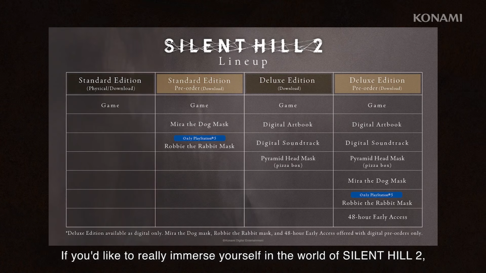 Konami Digital Entertainment Inc. (KONAMI) today announced SILENT HILL 2, the anticipated remake of the 2001 psychological horror will release on PlayStation®5 and PC via STEAM® on October 8. Players eager to secure their copy can pre-order digital and physical editions for SILENT HILL 2 starting today. Exclusive digital bonus content is included in the pre-order versions of the Standard and Deluxe editions of SILENT HILL 2. *