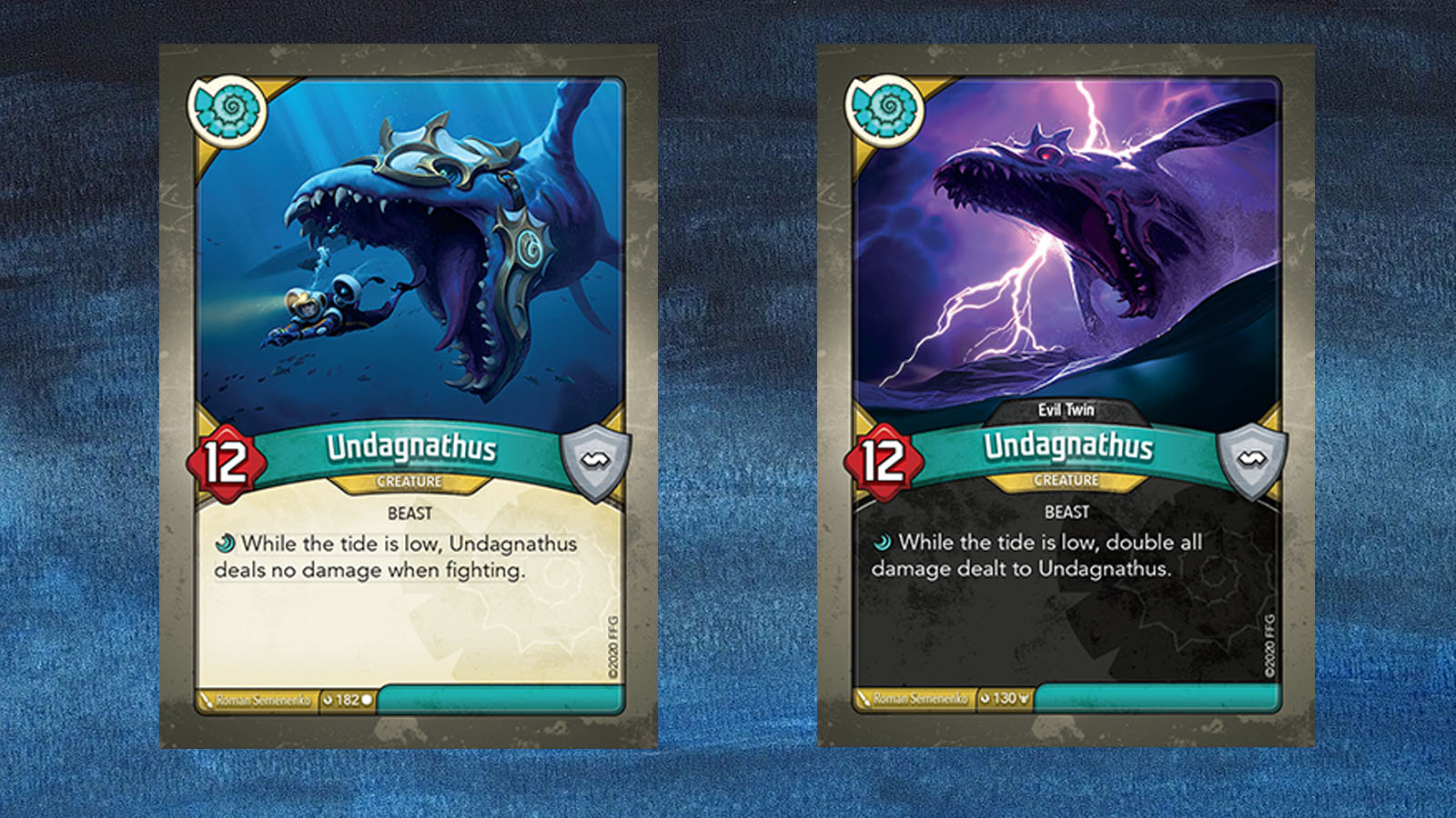 In the Dark Tidings set, many creatures have evil twin variants, and if you find an evil twin deck, every creature with an evil twin variant appear in that form. These evil twin creatures feature new artwork, graphic design, and abilities, making them a significant departure from the original creature. For example, if the “original” deck had Undagnathus and Lærie of the Lake, the evil twin copy of the deck would swap in the evil twin versions of Undagnathus and Lærie of the Lake , as well as any other creatures in the deck that have an evil twin version. You may know your evil twin exists somewhere on the Crucible, but finding and playing against your evil twin in the real world is an experience that you don’t want to miss!