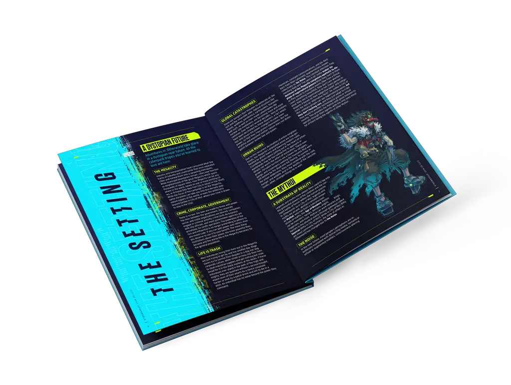 In a future, alternate version of the City of Mist universe, myths and legends manifest in a grim version of the real world. However, instead of the eponymous Mist, :Otherworld is plagued by the Noise, the sum of all stimuli in the accelerated information age. Humanity no longer awakens as Rifts; instead, corporations, crime syndicates, and governments struggle to control relics, temples, and rituals that will boon them with a fraction of a Mythos’ power and keep them relevant in a rapidly deteriorating political ecosystem. Your crew are the privateers, ronins, or hired guns that — for profit, honor, or revenge — seek out and take control over these coveted sources of magic, in an action-packed, cinematic cyberpunk story.”