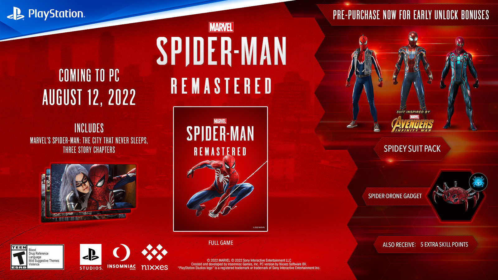 At Insomniac Games, we’ve been privileged to collaborate with our PlayStation Studios partner and experienced PC developer Nixxes Software in creating these PC versions. It’s been a labor of love for all of us over the past year, and today we finally get to reveal more detail about the features and enhancements you’ll see when Marvel’s Spider-Man Remastered releases on August 12 for PC. There’s also an exciting pre-purchase announcement, read on for more details!