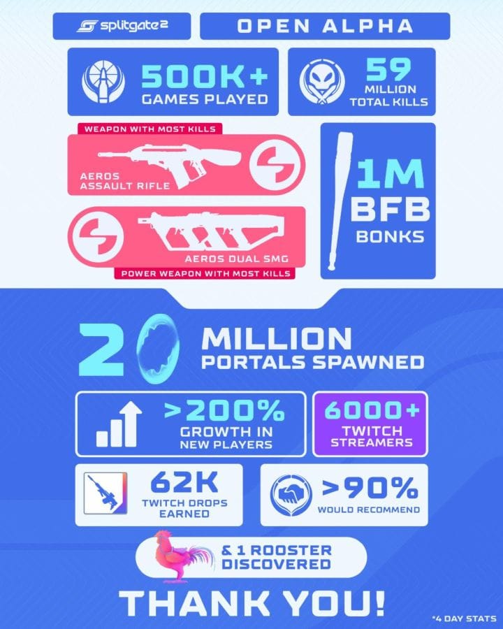 Splitgate 2 creator 1047 Games has released an infographic recapping the “Bonkers” reception of the Splitgate 2 Open Alpha, sharing key stats and other fun points of reference for just how wild things got in the much-anticipated portal-jumping FPS’ latest showdowns.
