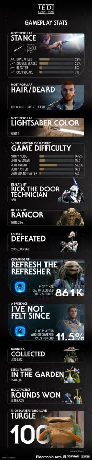It’s been a few weeks since Cal returned with Star Wars Jedi: Survivor. In that time, Respawn has been compiling some fun info regarding players’ decisions and combat statistics. They released a graphic showing favorite character customization options, the number of enemies defeated, and more. Check it out:
