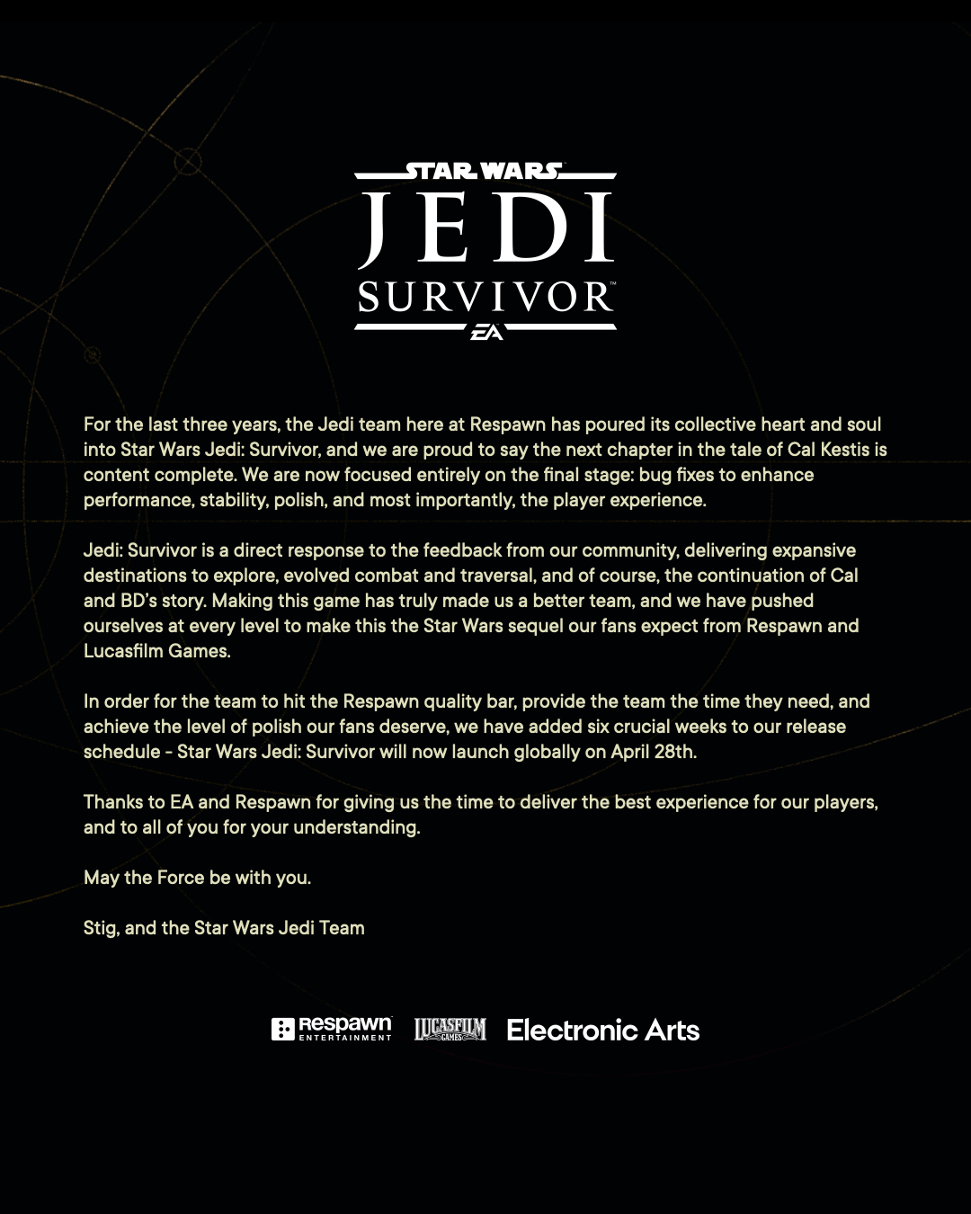 According to a tweet from the official EA Star Wars account on Twitter, Star Wars Jedi: Survivor has been delayed for six weeks and will now release on April 28th, 2023. While disappointing, I’m sure that the delay will result in a more polished final project. You can read the official statement below: